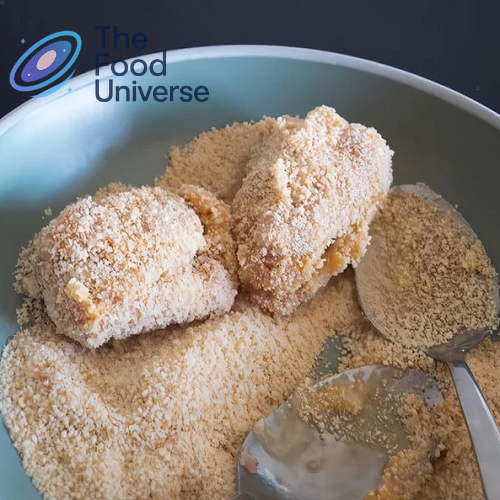 5. Dip the croquette in the beaten eggs. Then sprinkle with breadcrumbs.